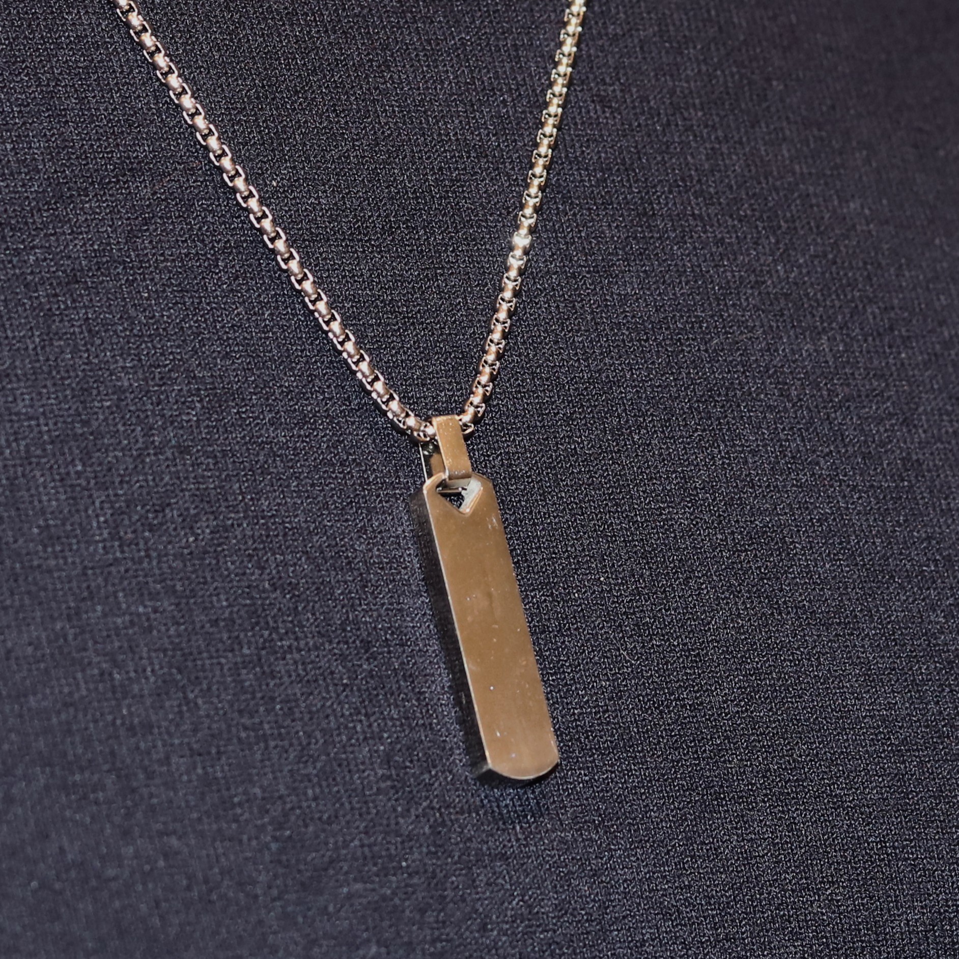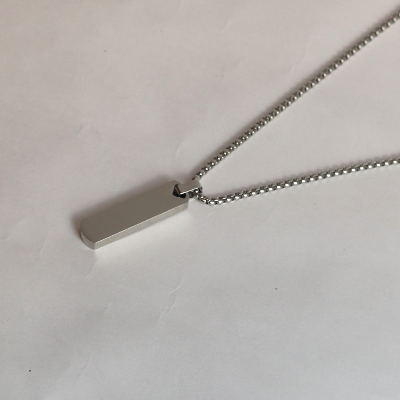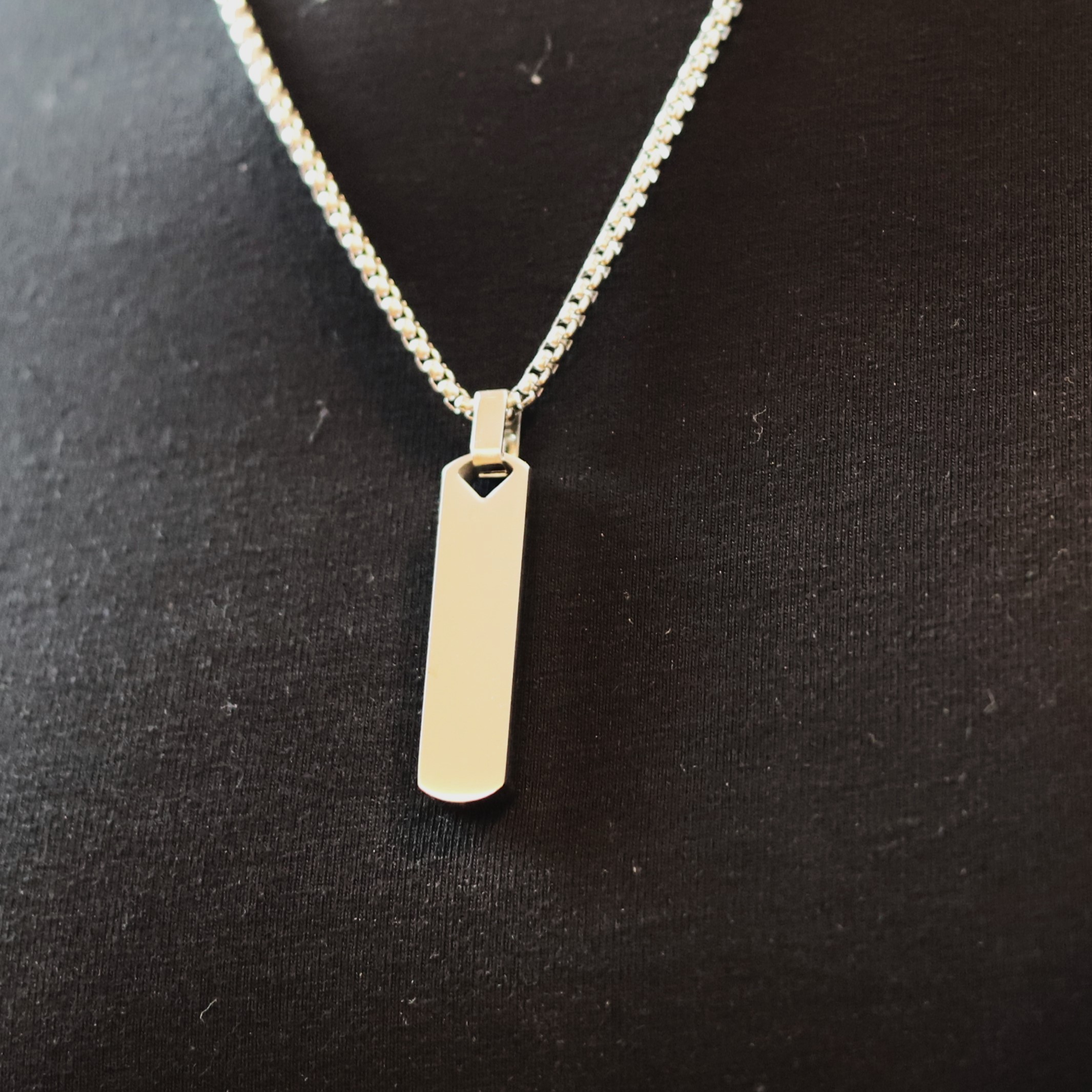 • Colar de aço masculino prateado, com pingente retangular com bordas arrendodas;