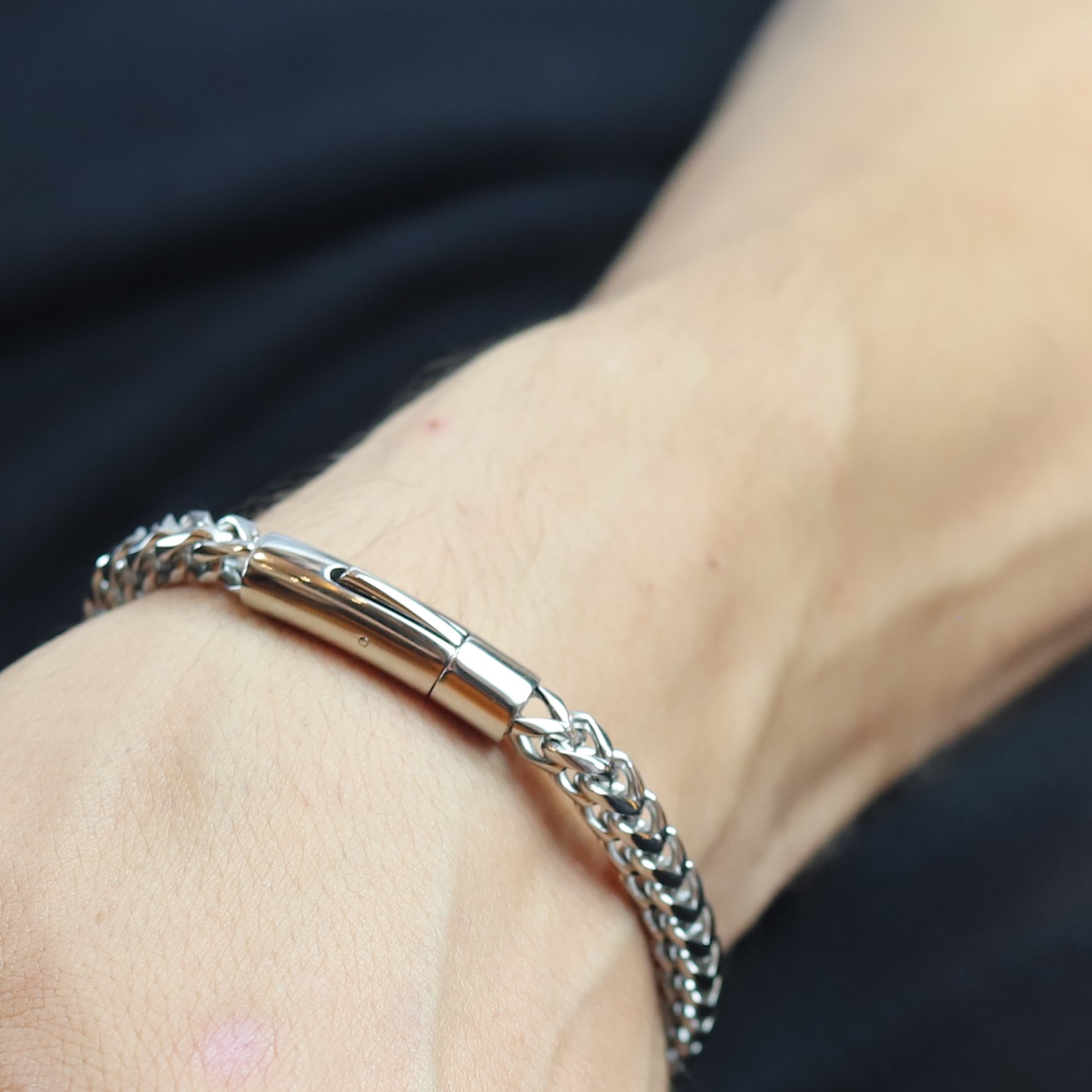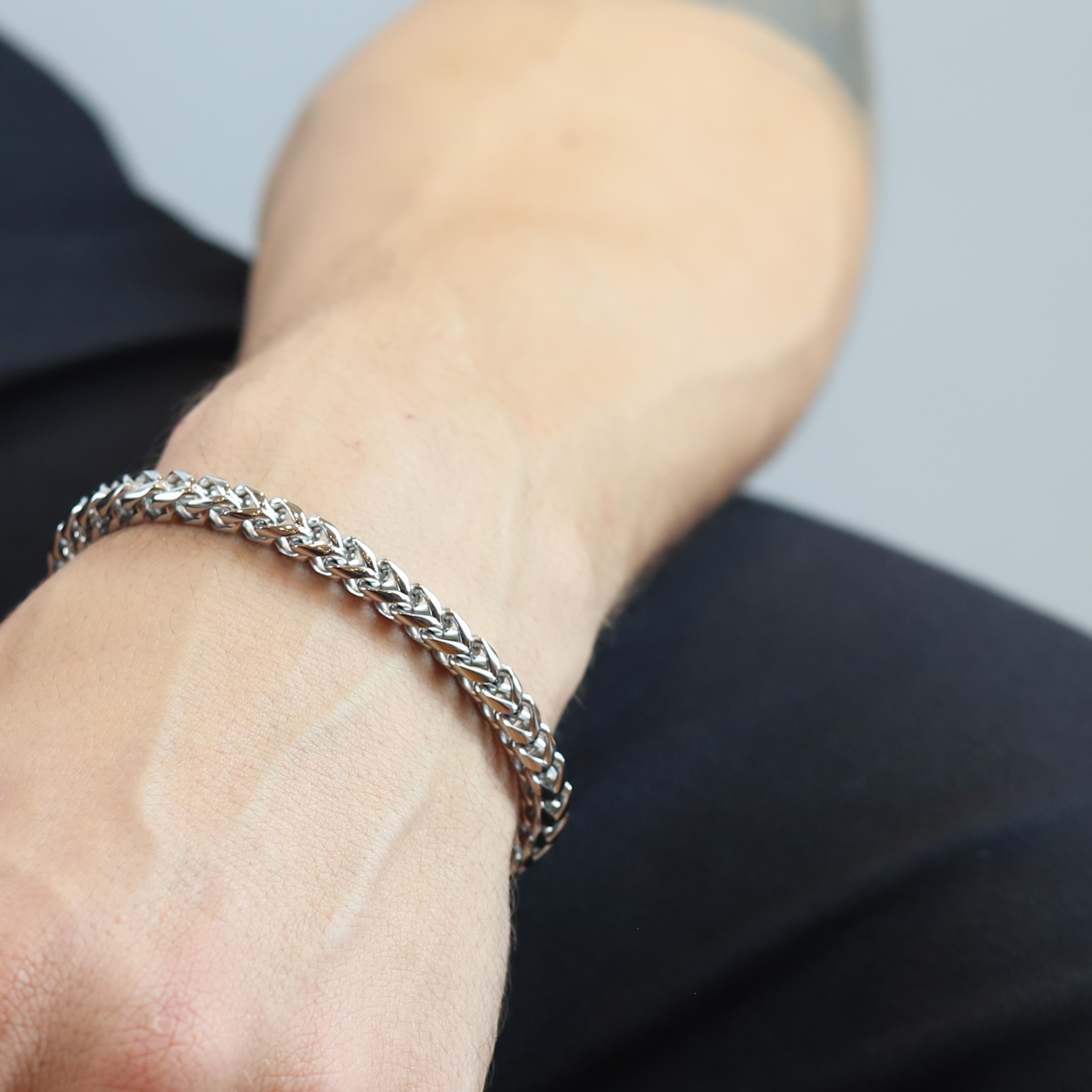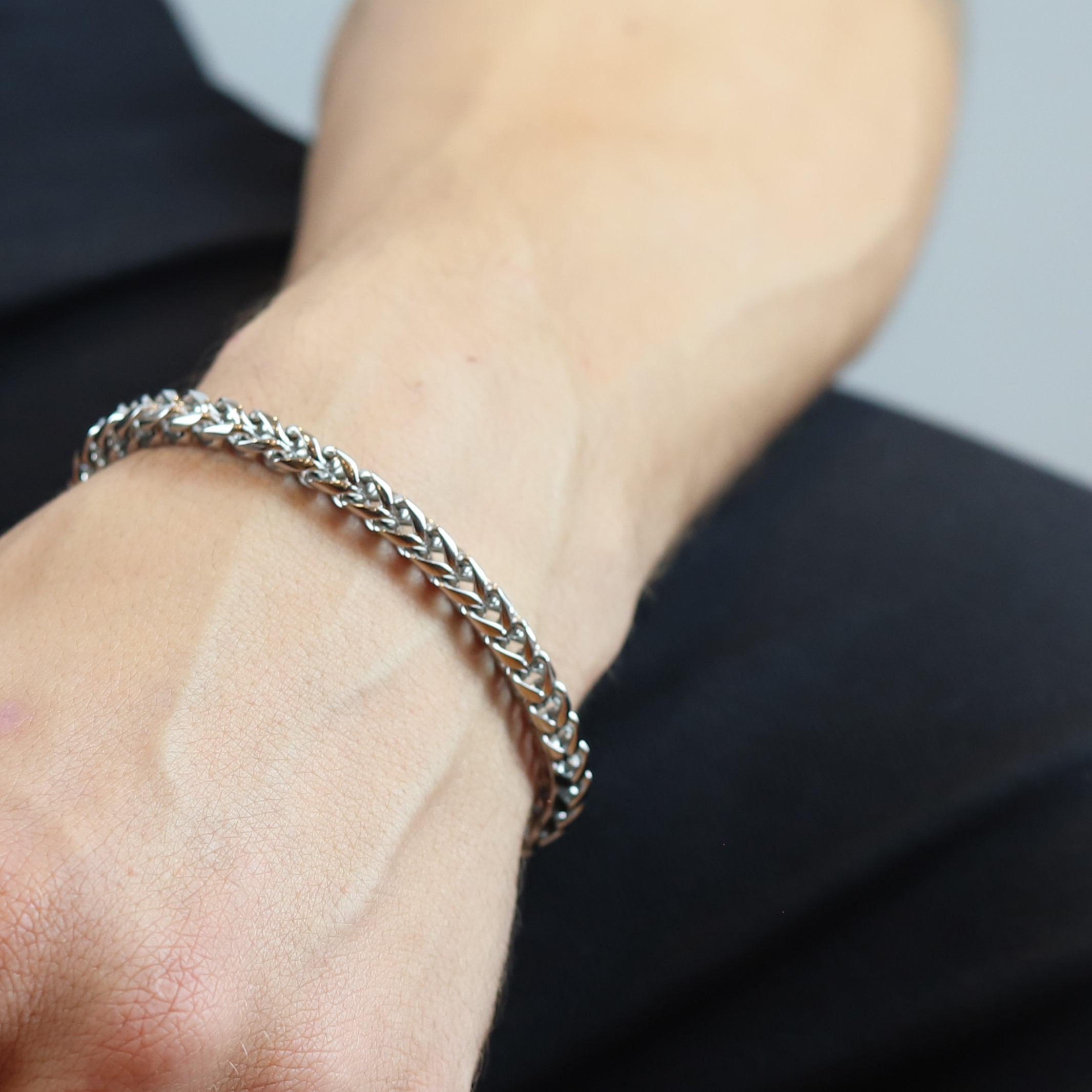 • Pulseira masculina de aço, prateada;