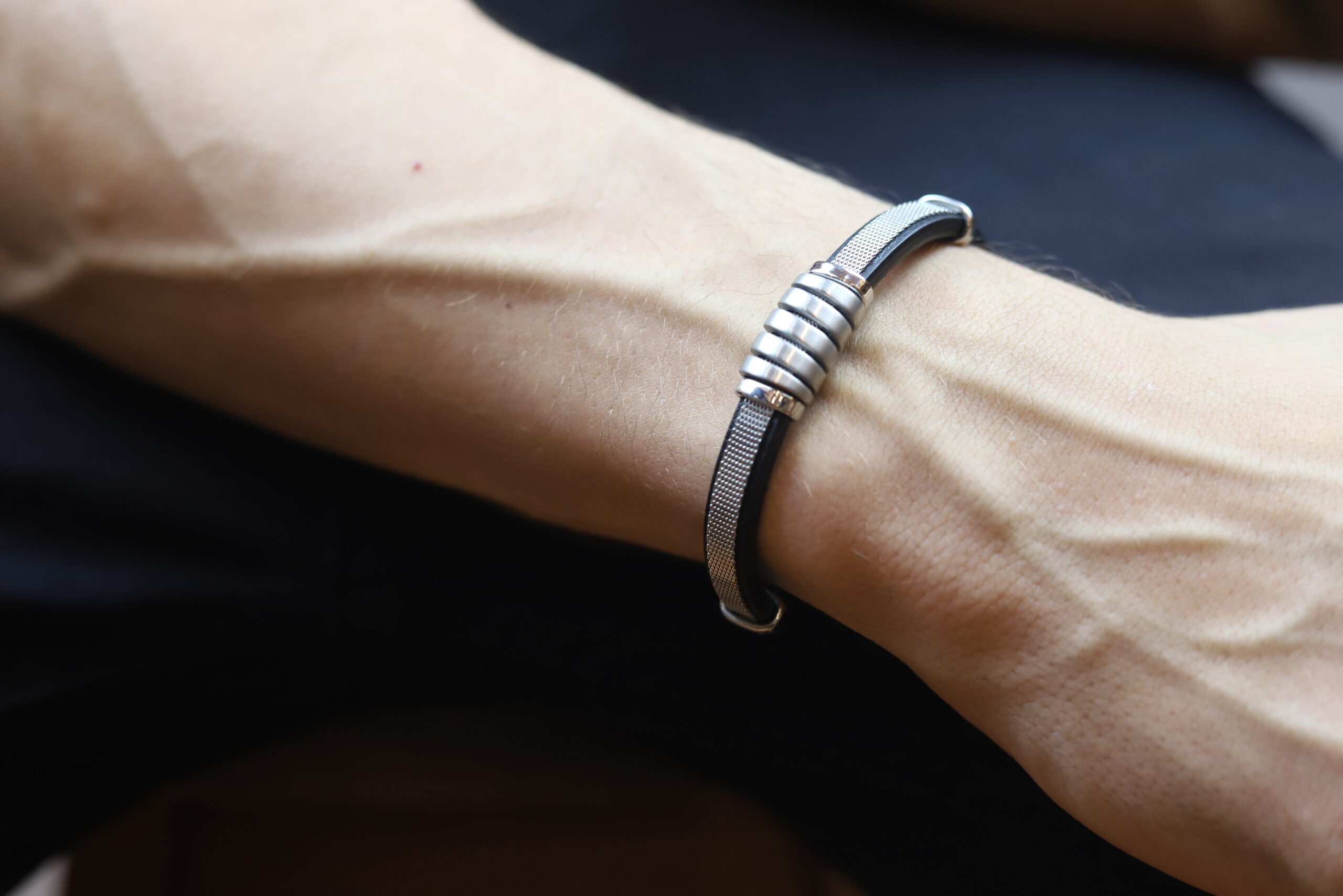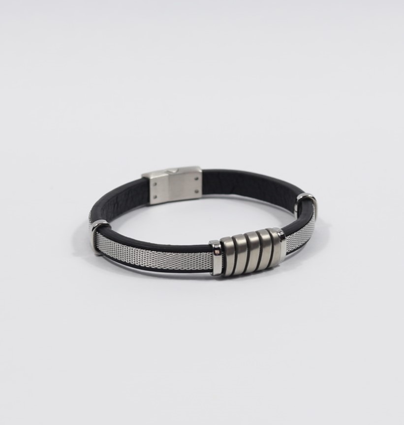 • Pulseira masculina de couro, com detalhes em aço;